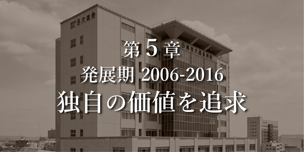 これらの目標達成への道標として、2007(平成19)年に第5次医療法で定められた「社会医療法人」への認定も目指すこととした。社会医療法人の認定を受ければ自治体などの公的病院と並び立ち、公共性の高い医療を提供する法人であるというお墨付きを得たと言える。認定要件は厳しいが、地域社会への貢献を追求することと、公的な支持を得て安定的な経営を続けることを両輪として動かし、さらなる発展を目指すのに必要な法人格であると考えた。新たなビジョンのもと、大雄会は動き出していく。