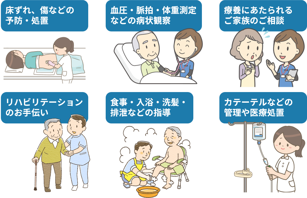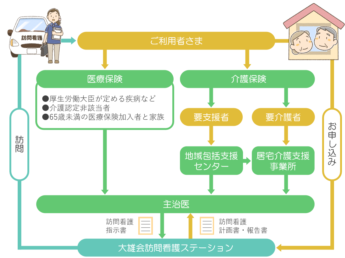 - 状態:病気、または健康に不安があり、かかりつけ医から訪問看護が必要と認められた方