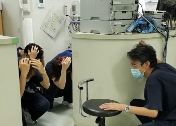 災害拠点病院である総合大雄会病院をはじめ大雄会の全施設において、職員および施設内にいる方々が訓練開始の放送を合図に、「姿勢を低く」「頭を守り」「じっとする」を実施しました。
