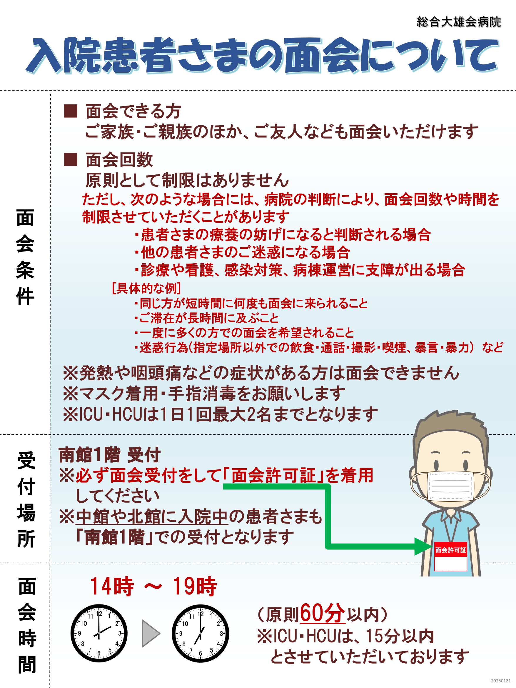 総合大雄会病院では入院患者さまへの面会について以下の通りご案内しています。