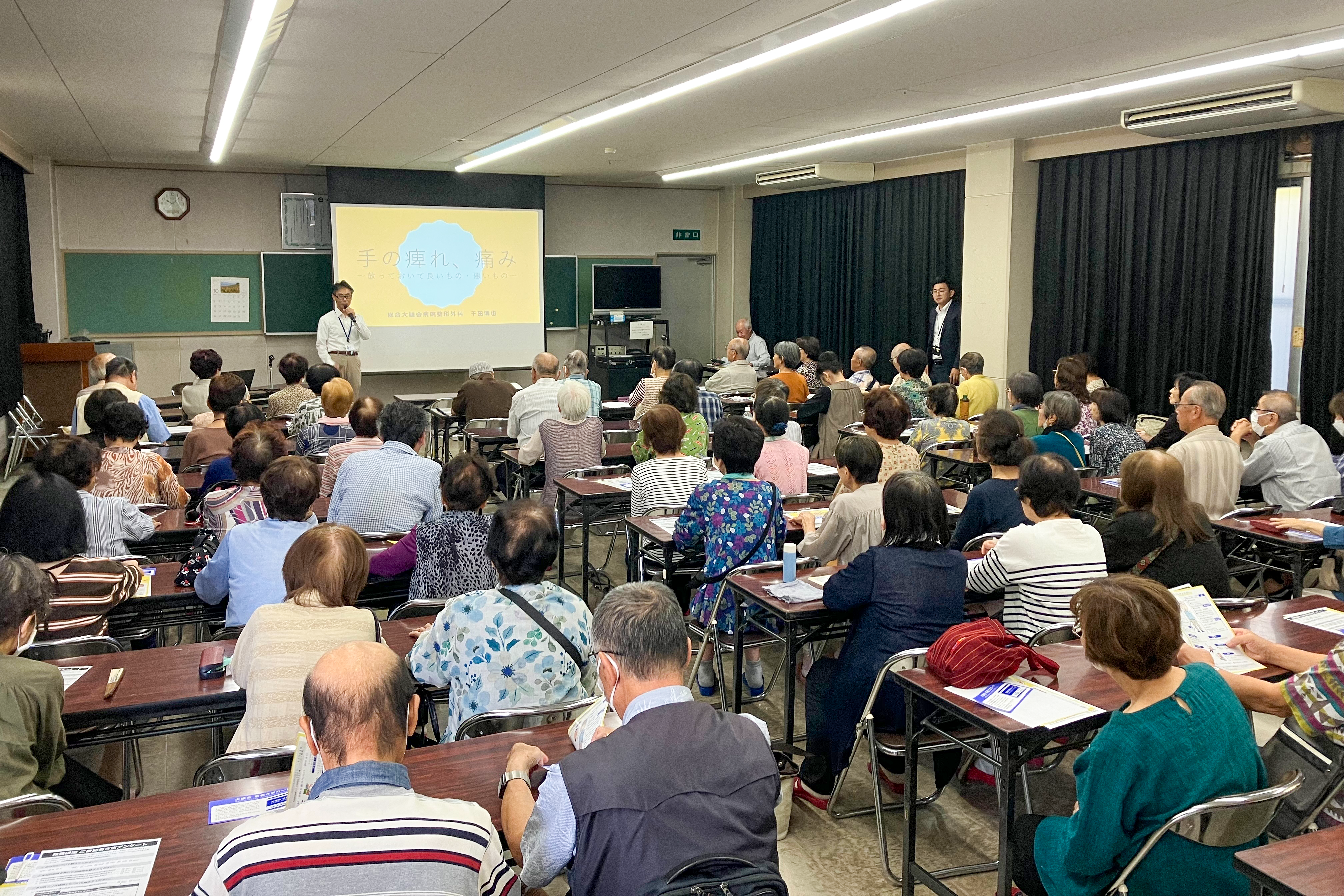 講演では、手根管症候群・肘部管症候群の見分け方や治療の流れを、スライドと動画で平易に解説。参加者は自分の手を確かめながら聞き入り、終了後には「千田先生に診てもらいたい」などの声も寄せられました。