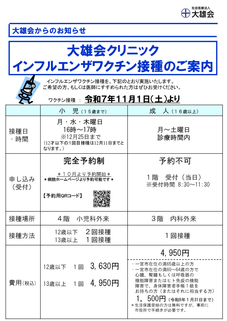 大雄会クリニックでは、11月1日からインフルエンザワクチンの接種を開始します。 詳しくは以下のPDFをご確認ください。