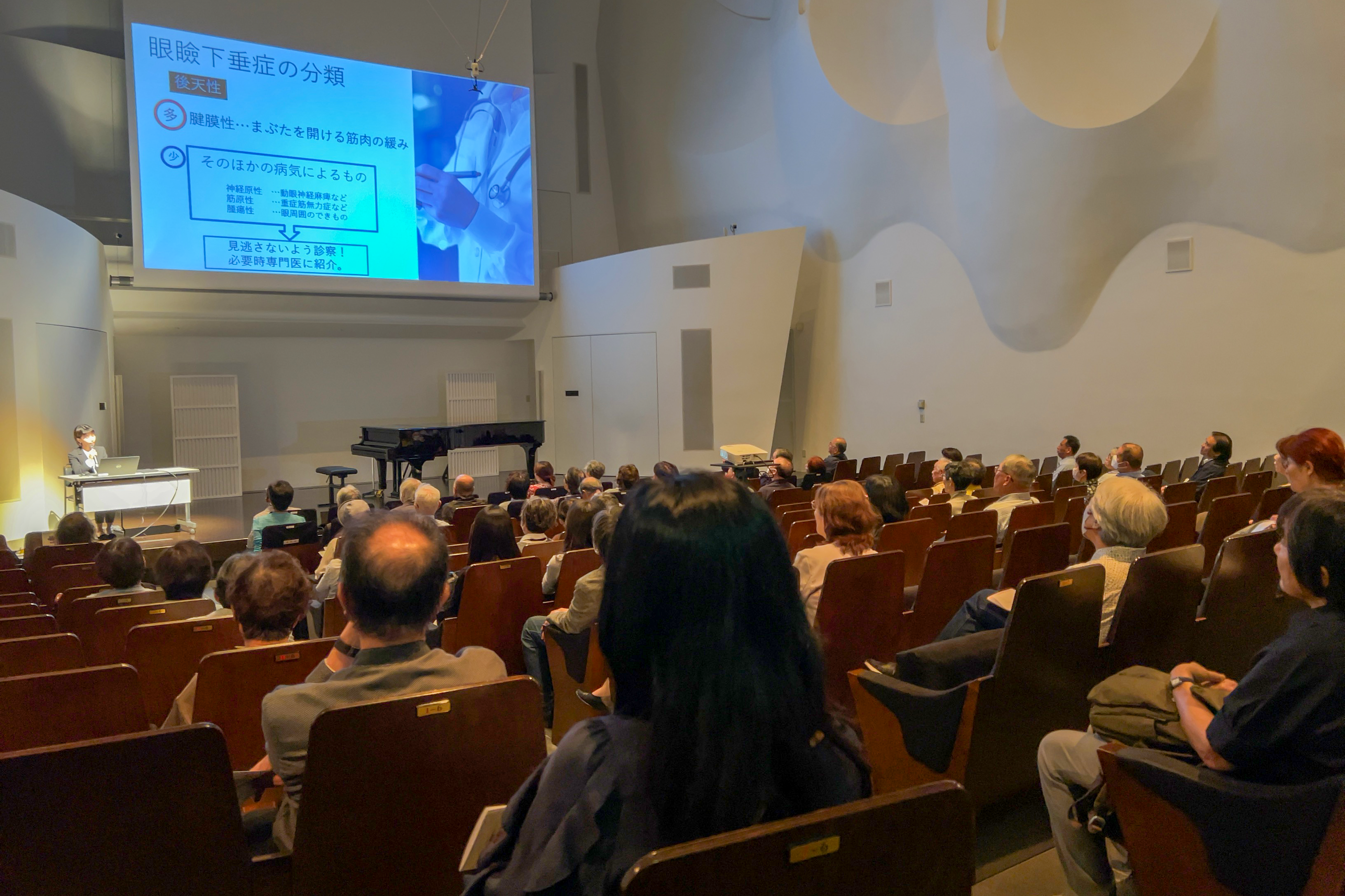 第1部では、総合大雄会病院 形成外科 中村万由子 医師による「眼瞼下垂症とその治療について」と題した講演が行われました。講演では、眼瞼下垂症の症状や手術についてイラストを使って分かりやすく解説。実際の症例写真を見比べながら、熱心に耳を傾ける参加者の姿が見られました。