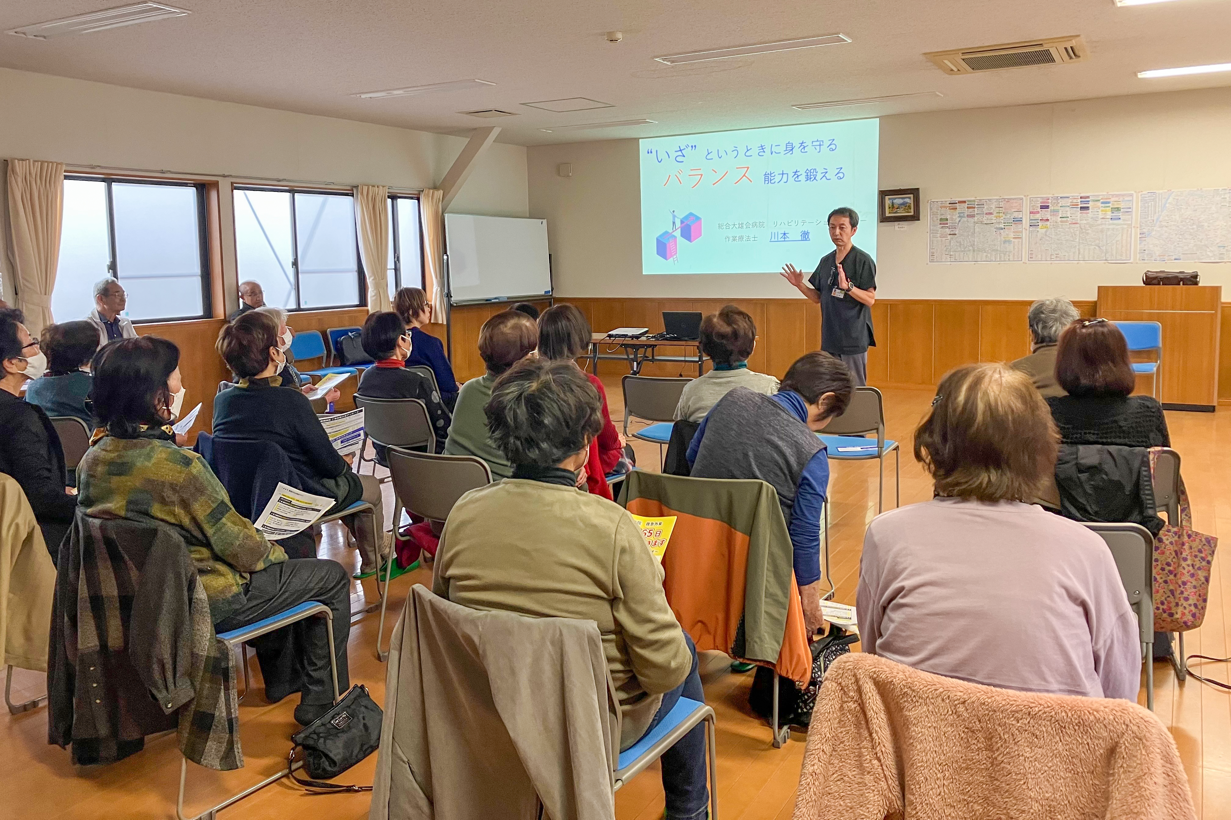 11月5日(水)、総合大雄会病院 作業療法士 川本徹 技士長による「“いざ”というときに身を守る バランス能力を鍛える」と題した講演会が、起つどいの里において実施されました。