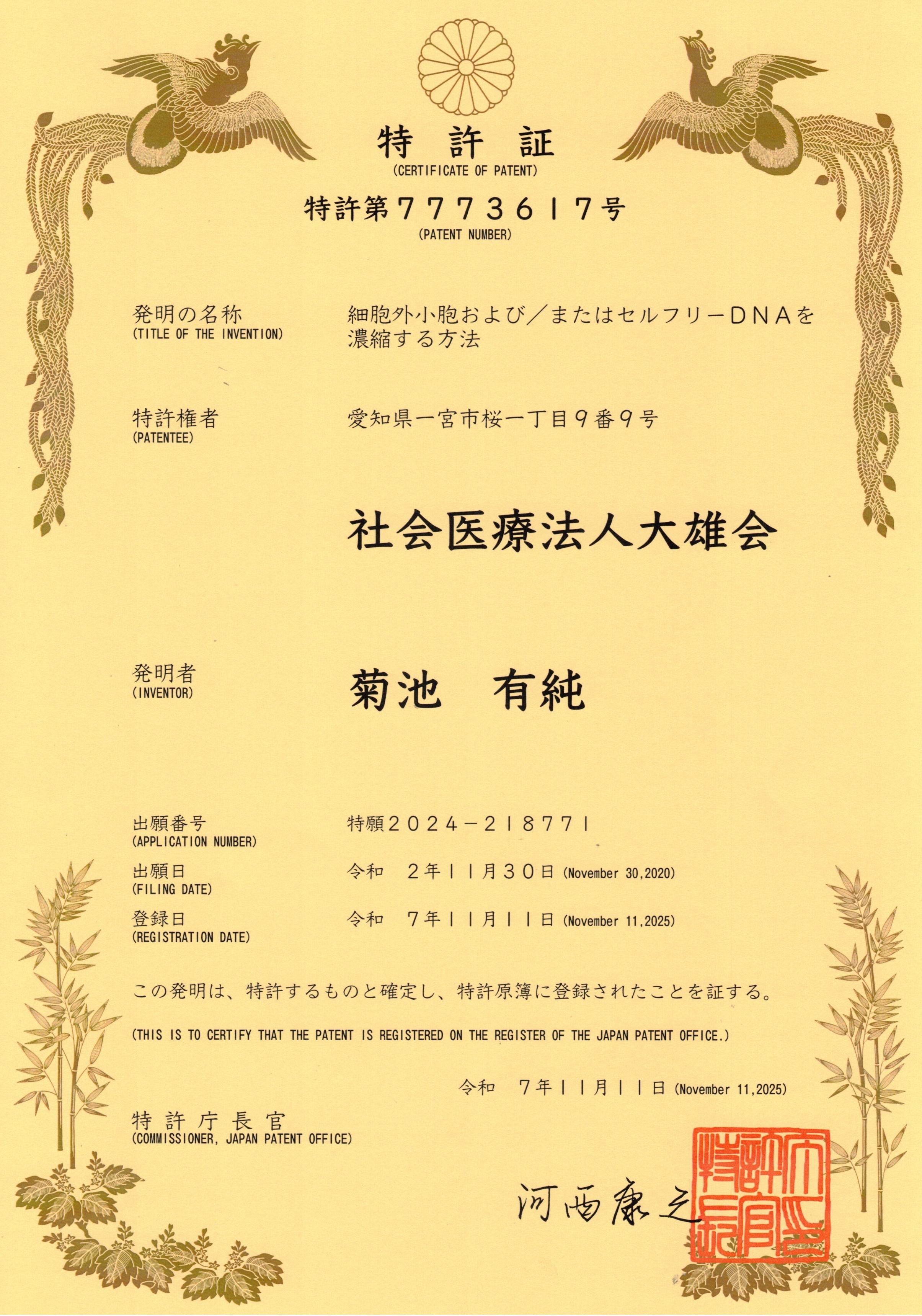 お知らせ【大雄会医科学研究所】特許取得のお知らせ